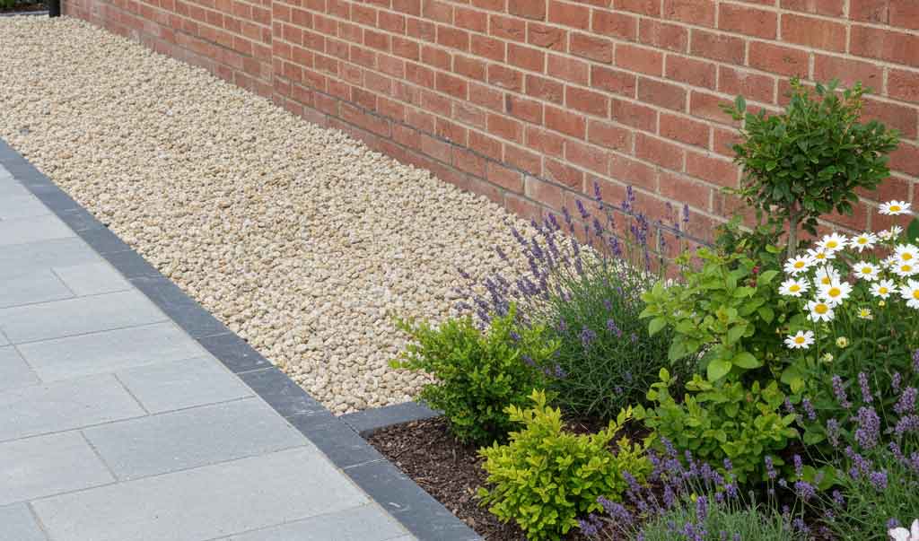 The finished exterior (neat gravel or paving) and the dry interior wall.